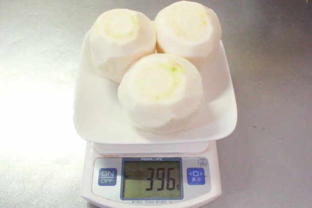 計量してみると、396g。塩の量は、皮を剥いたかぶの重さの2%です。そこで8gの塩を用意しました。
