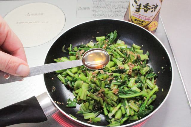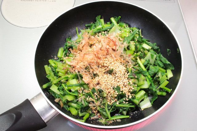 2. 弱火にして和風だしの素、しょうゆ、かつお節、白ゴマを加えて混ぜ合わせます。最後にゴマ油を加え、香り付けします。