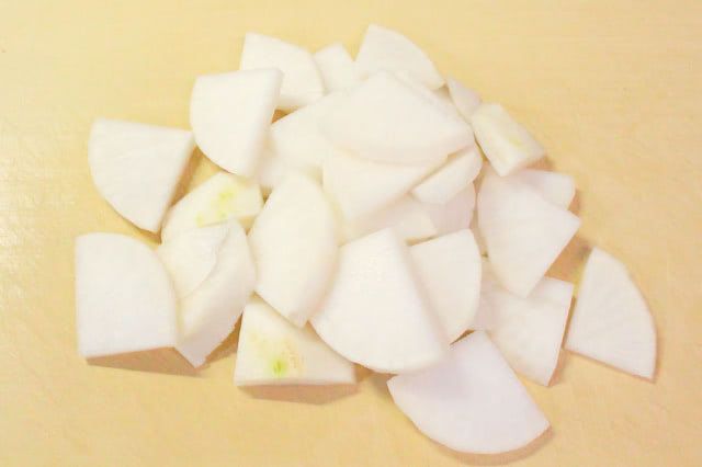 かぶは、4等分のくし切りにして、3mm厚さ程度のいちょう切りに。
