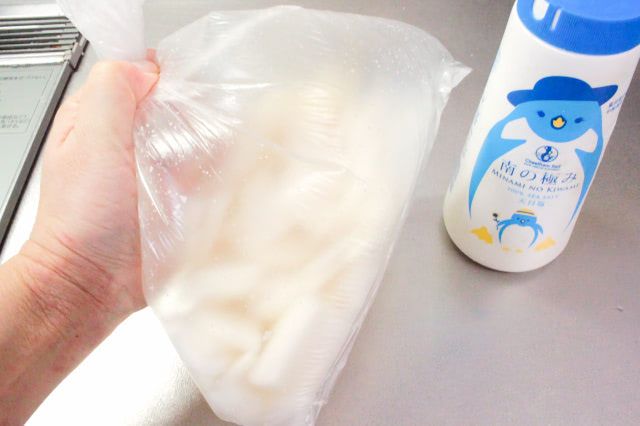 ポリ袋にかぶと塩を入れて、シャカシャカと15回ほど振りました。
