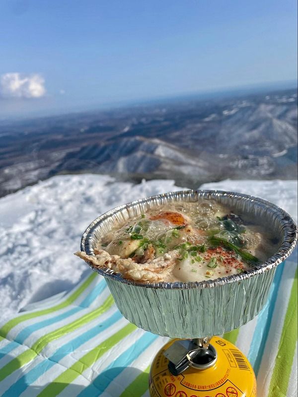この日の気温は−15度くらい。山頂で温めた、グツグツの鍋焼きうどんのおだしを飲んだとき、おいしすぎて意識が飛びそうになりました。でも一瞬で冷えました(笑)