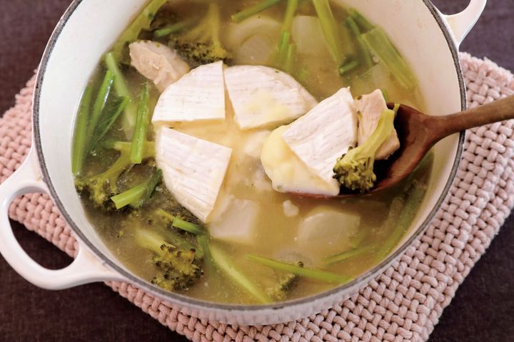 かぶとブロッコリーを煮た味わい深いスープに、カマンベールをまるごと投入。とろりと溶けて、おいしさ格上げ!