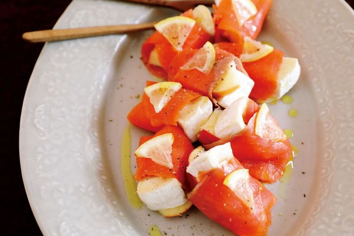 サーモン1枚をまな板に縦長に置き、カマンベール、りんご各1切れをのせ、手前から巻く。残りも同様に巻き、器に盛る。レモンをのせてオリーブオイル適宜を回しかけ、粗びき黒こしょう適宜をふる。
