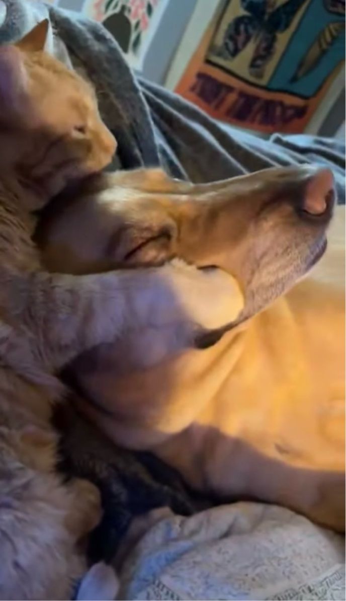 ネコの『チート』は、一緒に暮らすイヌの『サディ』のことが大好き! この日は、寝転ぶサディのお顔を包み込むようにギュッとハグする姿が目撃されました。