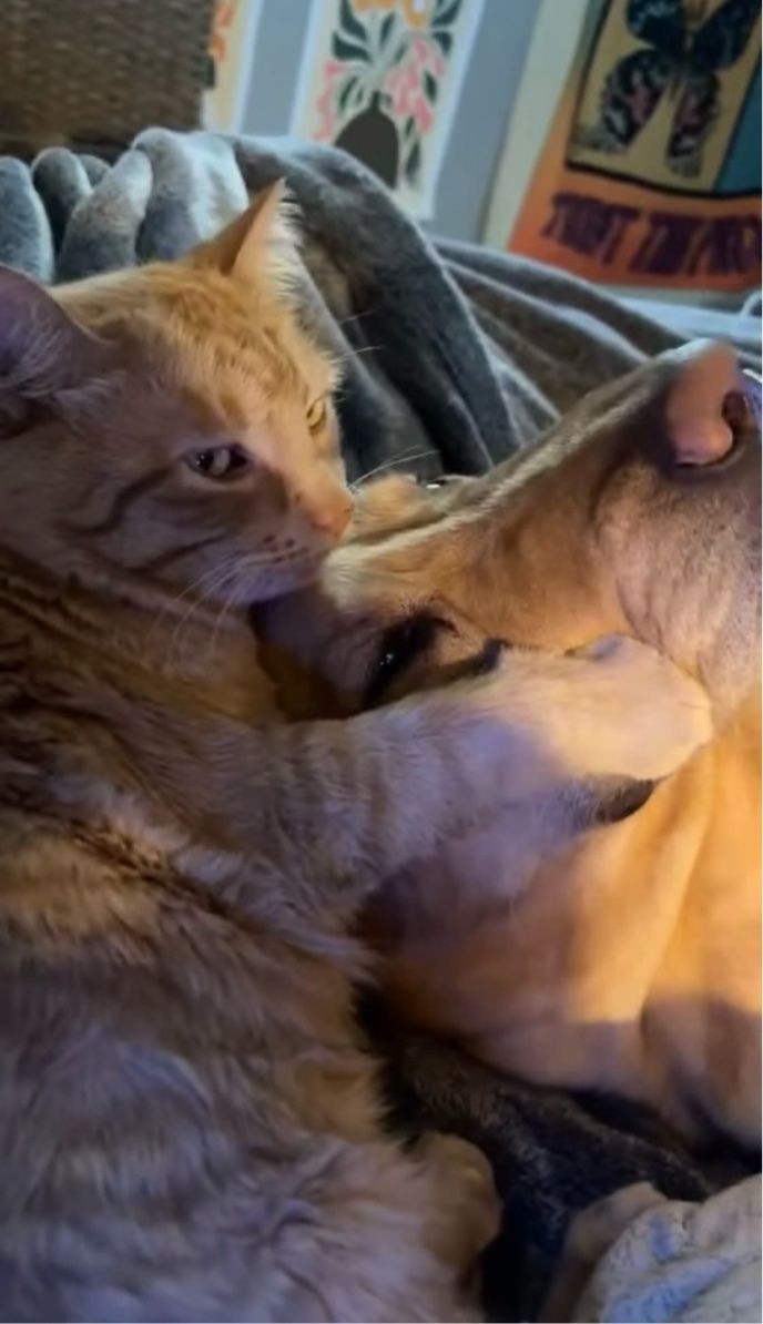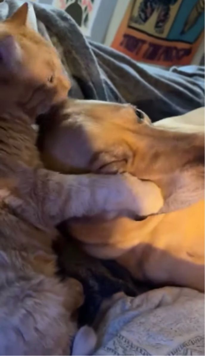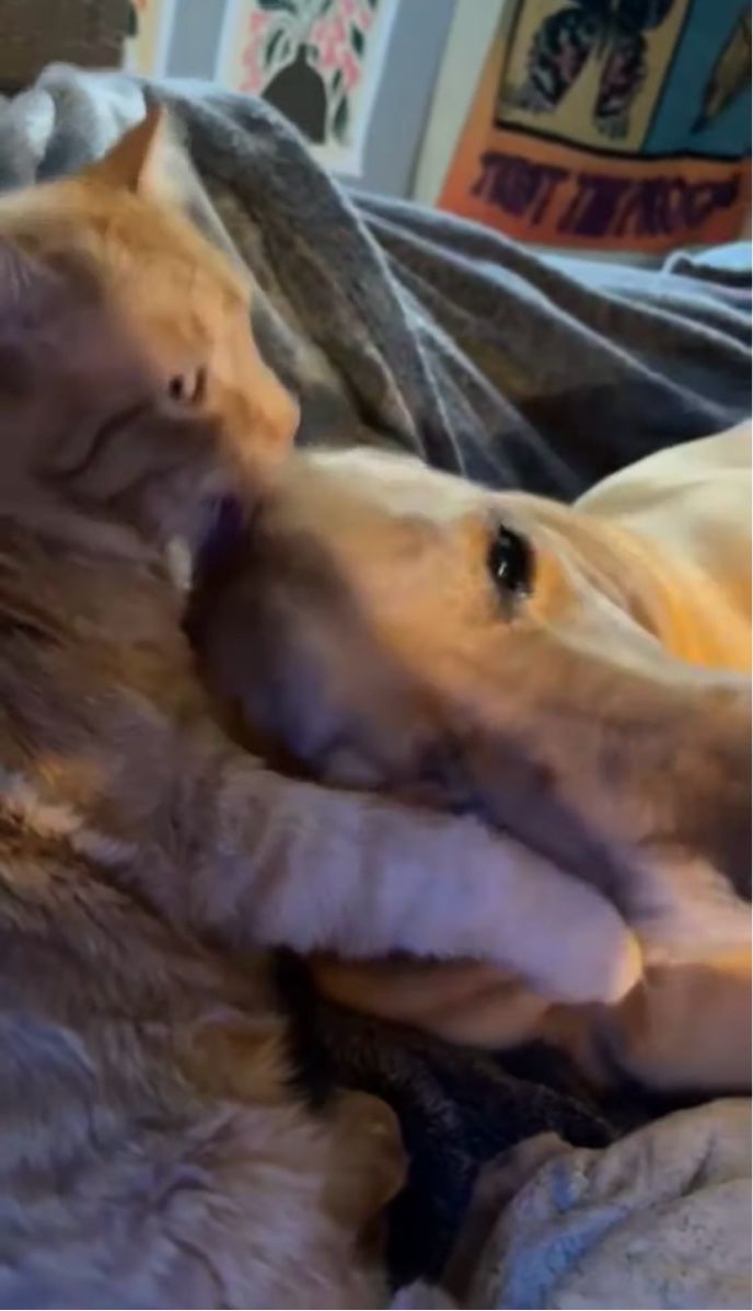 ぎゅ~~っとして離さない!大好きな同居犬に愛情たっぷりの熱いハグとキスを贈るネコ【アメリカ・動画】