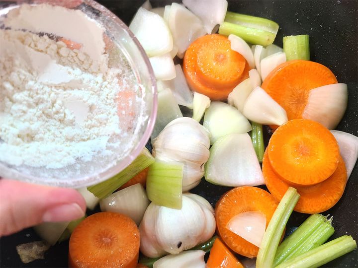 5. 3のフライパンで香味野菜を中火で炒め、野菜にツヤが出てきたら小麦粉大さじ1を加え、粉っぽさがなくなるまで炒めます。