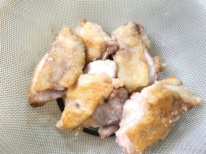 3. 全面にこんがりと焼き色がついたら、肉を取り出してザルなどで油を切っておきます。肉から出た脂はフライパンに少し残しておきましょう。