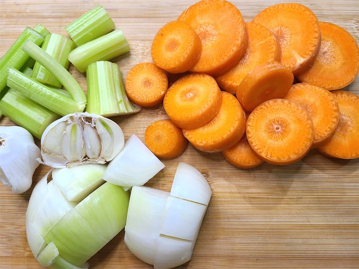 4. [香味野菜]は風味をとるためだけに使うので、にんじんは皮つきのまま使います。玉ねぎ、にんじん、セロリを1.5~2cmくらいの厚さにカットします。にんにくは皮つきのまま、1株を半分に切ってそのまま使用します。セロリの葉っぱは煮くずれてしまうので、使用するのであればたこ糸などで束ねて使用するといいそうです。わたしは使用しませんでした。