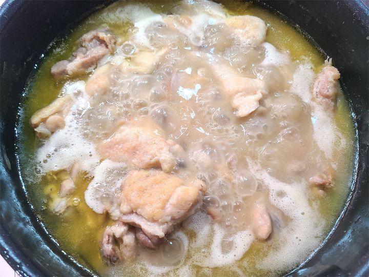 6. 3の肉をフライパンに戻し、白ワイン、具材が浸るくらいの水(分量外)を加え、強火で沸かします。アクが出てきたらとります。