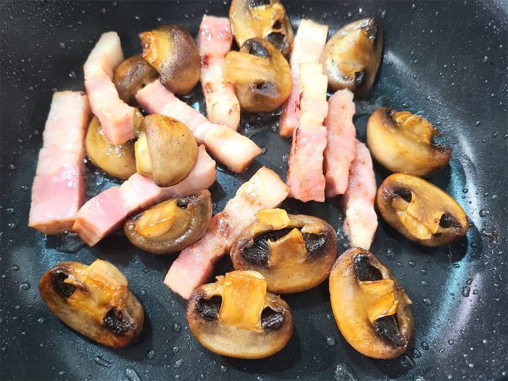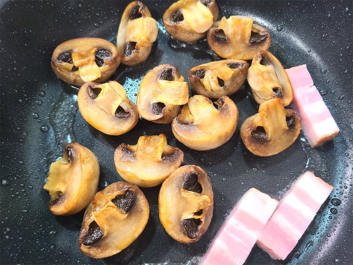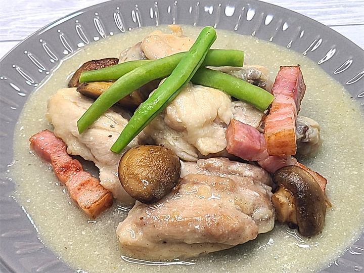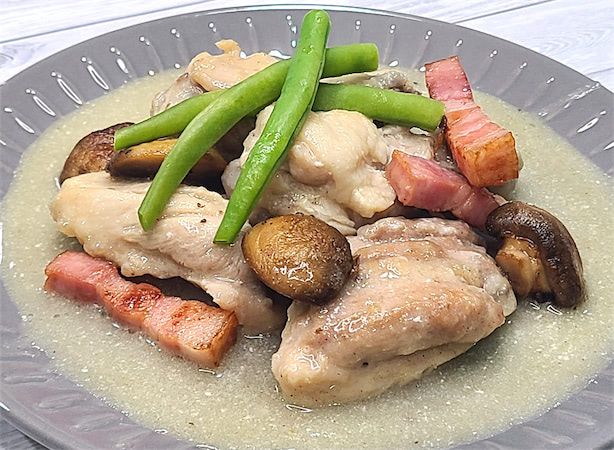 付け合わせのいんげんは塩茹でしただけですが、マッシュルームとベーコンのソテーは志麻さん直伝の「きのこソテーの作り方」を参考にしました。材料はマッシュルーム、ブロックベーコン、塩、こしょうのみですが、ベーコンの塩気もあってまろやかなクリーム煮との相性抜群♪食べ飽きさせないアクセントになるので、きのこのソテーはおすすめです♡