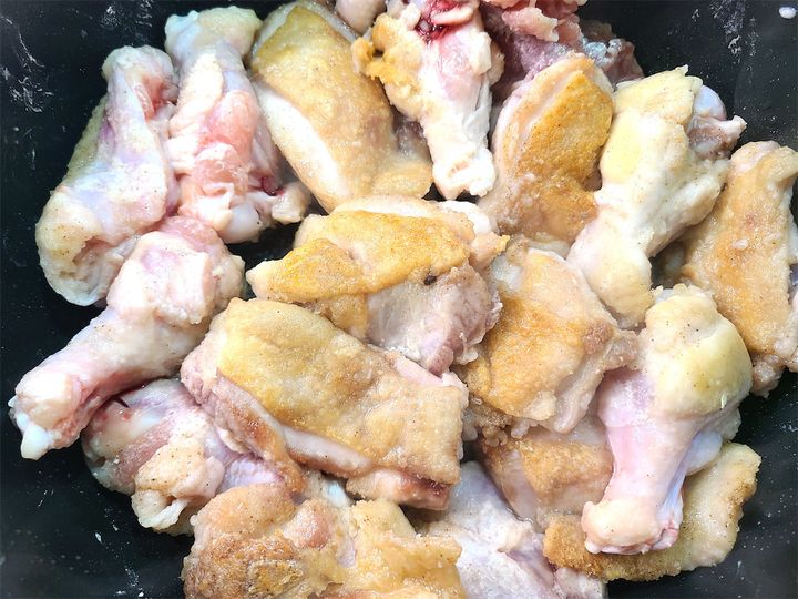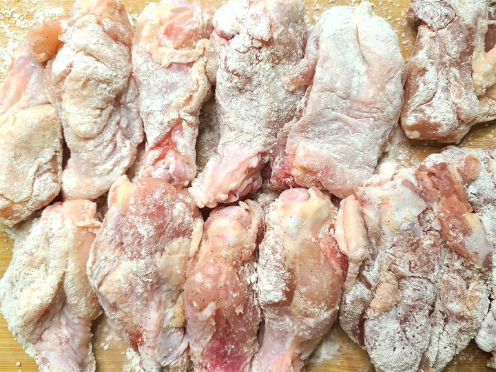 1. 鶏肉の水分をしっかりと拭き取り、もも肉は食べやすい大きさにカットします。その後、塩、こしょうをし、小麦粉大さじ2をまぶしておきます。