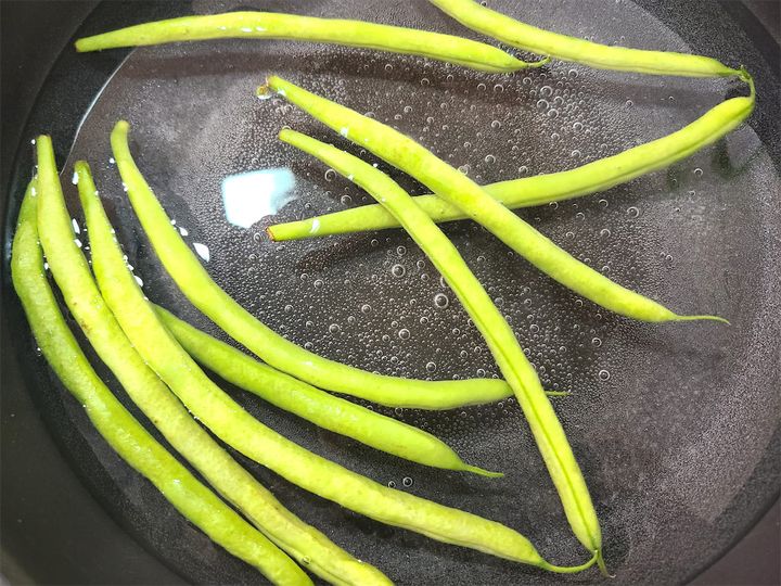 8. 煮込んでいる間に、付け合わせの野菜を用意します。わたしは志麻さんおすすめのいんげんの塩茹でと、マッシュルームとベーコンを炒めたものを付け合わせにしました。