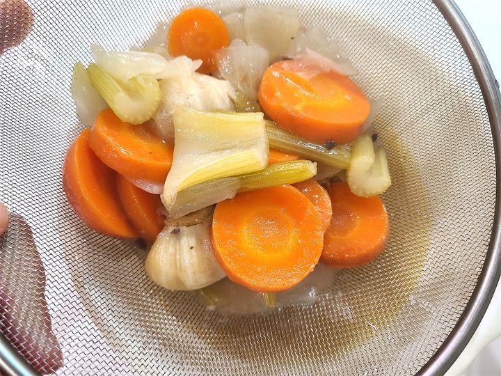 9. 7の中から肉だけを取り出し、煮汁を濾します。このとき、玉ねぎやにんにくを少し潰すようにして搾り取るといい出汁が出るそうです。