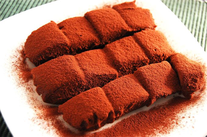ただ、けっこうやわらかいので、お皿にべっとりとくっついて、ちょっと食べづらい。ココアパウダーは上からかけるだけでなく、全体にまぶすと食べやすいかなと思います。