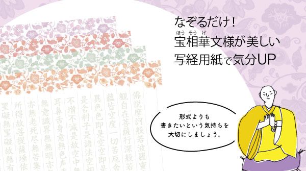 難しい漢字が並ぶ「般若心経」も、なぞり書き写経用紙や漢字練習シートがあるので、初心者でも安心です。