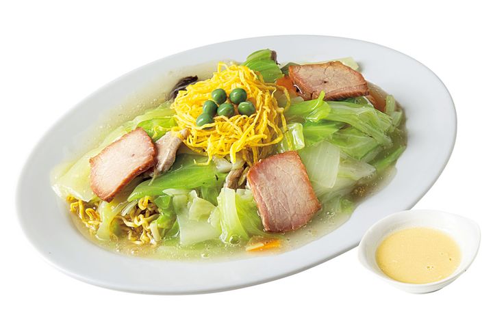 ルーツは大正時代、長野市にあった中華料理店〈福昇亭〉のあんかけ焼きそば。“海なし県”ゆえ海鮮を使わず野菜と肉をどっさり入れた味が人気を呼び、周りの店も独自のレシピで追随したことで「あんかけ文化」が発展した。元祖の味を受け継ぐのが、初代の息女が上田市に開いた〈福昇亭〉。細いちぢれ麺をせいろで蒸した後、中華鍋を返しながらじっくり炒める。パリッと焦げ目がついた麺に豚骨ベースの塩味のあんが絡み、だんだん軟らかな食感に変わるのが醍醐味。