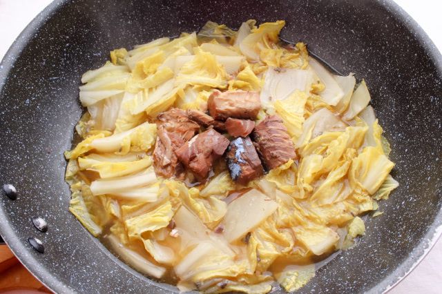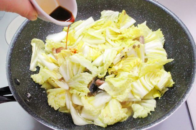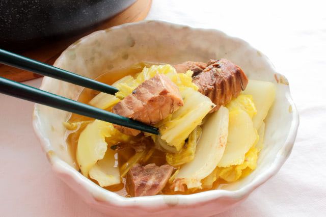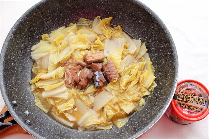 水を加えているうえ、白菜からも水分が出ているので、缶詰の煮汁がちょうどよく薄まり、汁ごとおいしくいただけます。