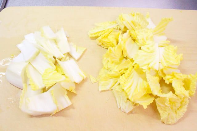 1. 白菜をきれいに洗い、3cm幅に切ります。