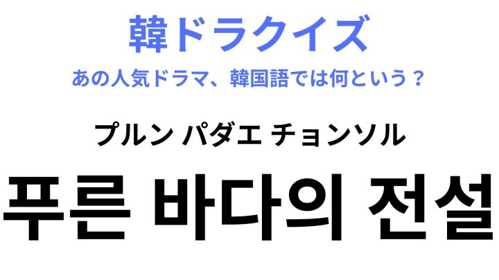 「푸른(プルン)」=「青い」、「바다(パダ)」=「海」、「의(エ)」=「の」、「전설(チョンソル)」=「伝説」を組みあわせると、「푸른 바다의 전설(プルン パダエ チョンソル)」となります。