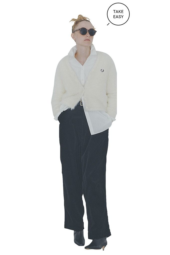 白シャツ/KUNIKO_NEMOTO×NAVE(NAVE) 白カーディガン/フレッドペリー × レイ ビームス(レイ ビームス 新宿) 黒コーデュロイパンツ/Oblada(シンチ) サングラス/アヤメ ベルト/MANILA(エディット フォー ルル) 黒ブーツ/ネブローニ