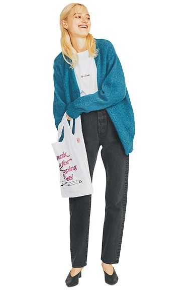 毛足長めのゆるカーディガンも冷静に着られるコバルトブルー。濃インディゴのストレートデニムを合わせて浮かれずクールに。ユニセックスならではのサイズは、軽めのアウターとしても最適。