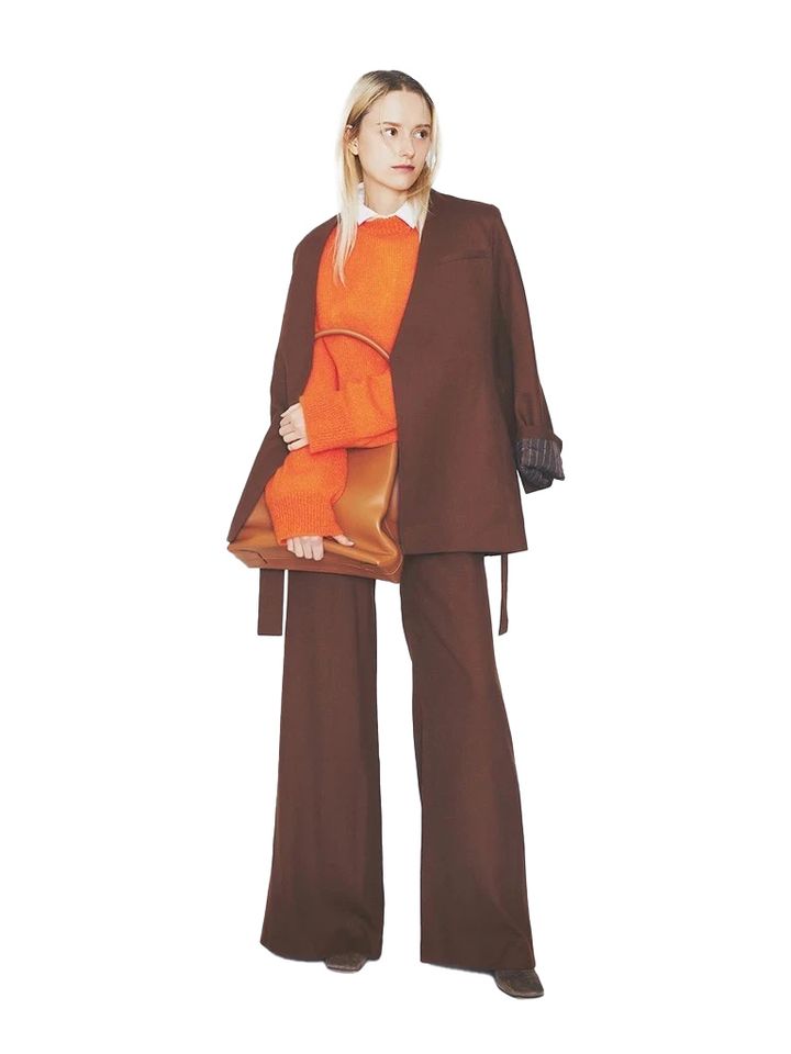 あたたかみのあるオレンジニットにベージュからブラウンのセットアップをON。美脚効果の高いワイドパンツのおかげで配色のなつかしさをくつがえすシャープなフォルムに。