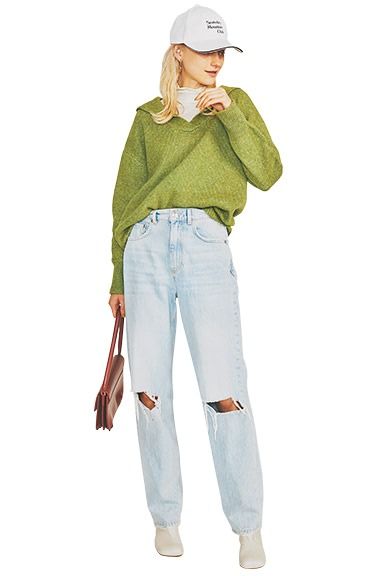 クラッシュデニムの抜け感で穏やかなグリーンにメリハリを。コートにも見られる旬のセーラーカラーのニットに、白を差して軽快に。