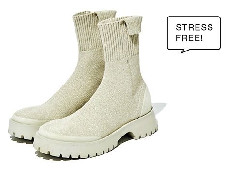 ecoニットブーツ(5)/emmi(エミ ニュウマン新宿店) 「ストレスのかからないはき心地が支持され、人気が右肩上がりのニットブーツ。ゴールドは今季の新色です。ブーツにありがちな窮屈さがなく、軽量ソールと低反発のインソールで、長時間はいても疲れにくい仕様に」(チーフデザイナー・有吉直子さん)
