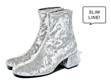 ベルベットブーツ(5.5)/ル タロン グリーズ(ル タロン グリーズ ルミネ新宿店) 「奥行きのある光沢が魅力のベルベットは、膨張して見えやすいという一面もある素材のため、足首のすっきり感にこだわり何度も修正を重ねました。親指が前に出たオブリークトゥなので、ラウンド型でもモードな印象に」(デザイナー・高塚久良巨さん)
