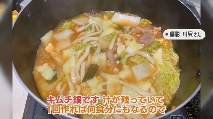 川尻さん:「きのうはキムチ鍋です。汁が残っていて1回作れば何食分にもなるので。栄養価の高いホウレン草や小松菜だったりすると手軽に鍋に入れても美味しいなと思う」