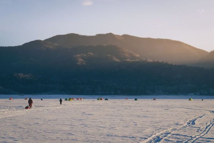 大きなソリの上にテントや釣り道具、中にはストーブなども積み込んで、ワカサギ釣りを楽しむ方が多く見受けられました。