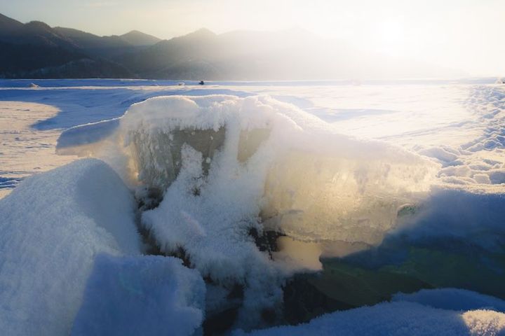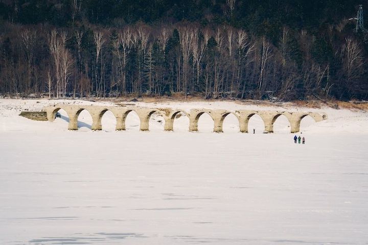 ※糠平湖は今シーズン、1月27日から立ち入り禁止となっています。湖の水位が低く、湖の底から発生するメタンガスによってできる「ガス穴」が多く出現したことや、暖冬の影響などで氷が薄い場所も多く、氷が割れる危険が高まってきたことが理由だということです。