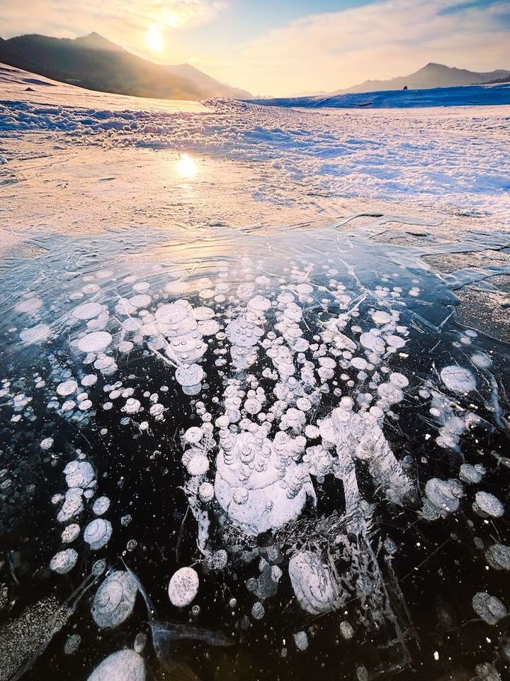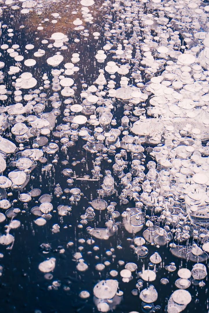 湖の底の植物から出たメタンガスの気泡が、湖の中で凍り、泡の形が見えます。