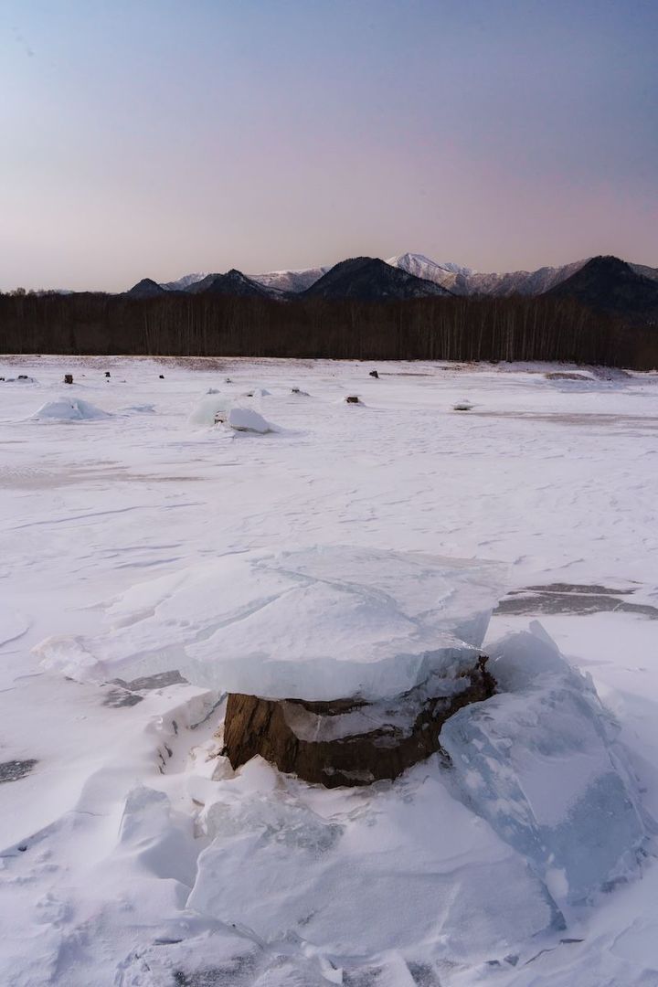 糠平ダムの稼働によって、糠平湖の水位は変化します。水位が減ったときに、切り株の上に氷が残り、このような現象が見られるそうです。