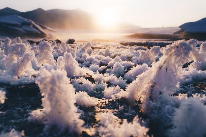 フロストフラワーを見るには、地面に雪が積もっていないこと、氷点下15度以下であること、風がないこと、など条件があります。