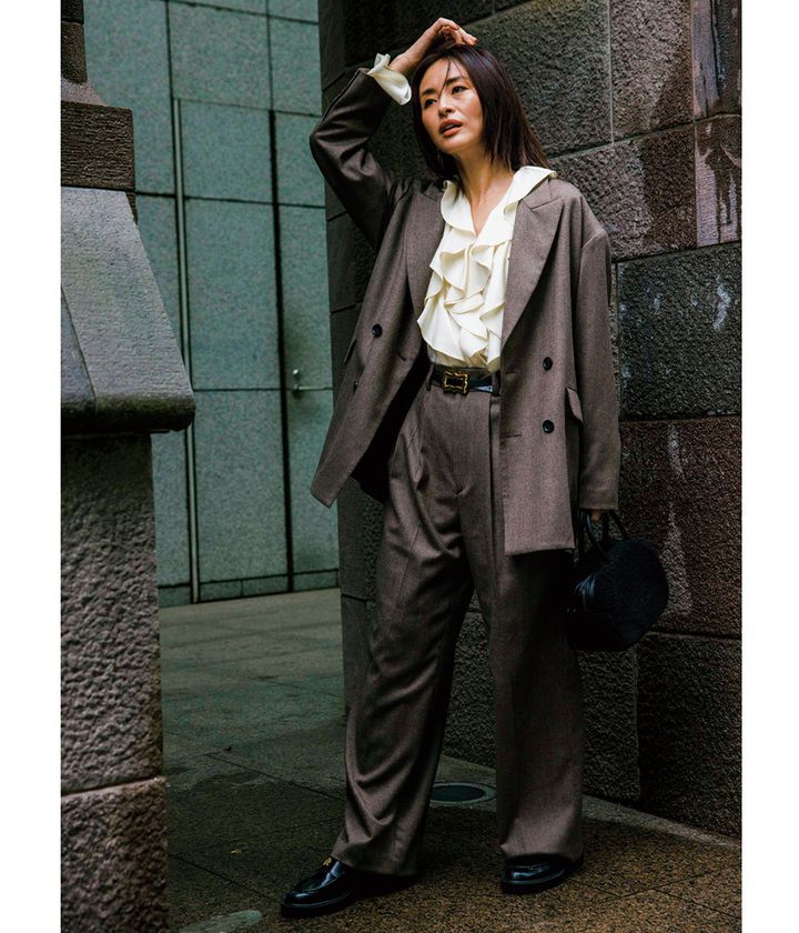 信頼感が欲しいお仕事シーン、セットアップのカッコ良さはそのままに、ブラウンにスイッチして大人の余裕を醸し出して。フリルブラウスやアクセ感覚のワンポイント付きベルトで可愛げを足して“オジ感”は払拭!