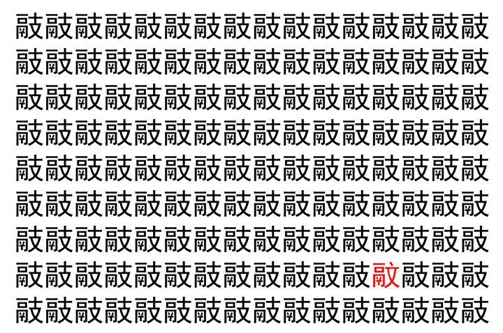 画像の中には、「䰙」という漢字が縦に9行、横に16個並んでいます。 全部で144個となりますが・・・、そのうち1つは「異なる漢字」となってますよ!!