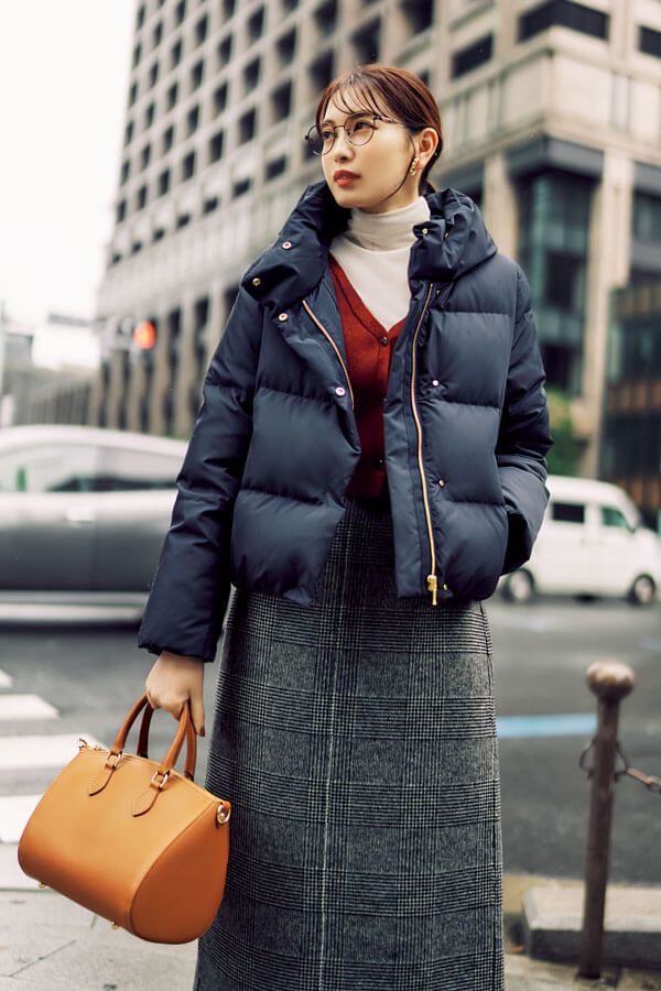 3. グレンチェック×ネイビーならダウンでも品格コーデが完成<2/10のコーデ>