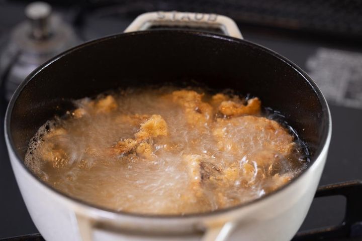 4、鍋でサラダ油を170℃に熱する。3を入れキツネ色になるまで揚げる。