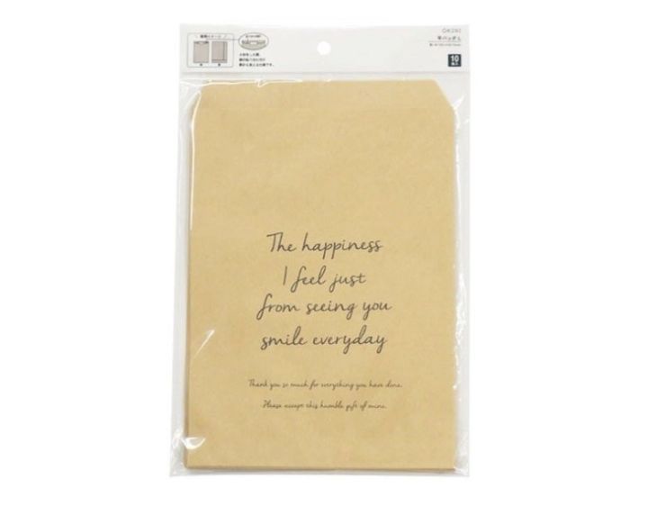 「毎日あなたの笑顔を見るだけで幸せ」という意味の英文が書かれた、プチギフトに使いやすいクラフト袋。日常で渡したいちょっとしたプレゼントも、さりげなくラッピングされていると、開けたときの喜びや幸福感がひと味違うものになるはず!