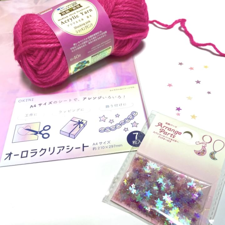 オーロラクリアシートはセリア、スパンコールはキャンドゥ、毛糸はダイソーの商品を使用。どの100均にも同じようなアイテムが展開されているので、真似しやすいアイデアです。
