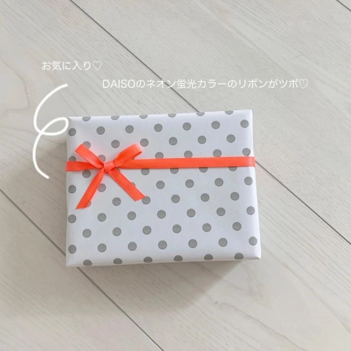 @shiroiro.homeさんは、ダイソーのラッピングペーパーとリボンを使って、ボックスを素敵に包装されています。モノトーンなラッピングペーパーと蛍光カラーのリボンのコントラストが素敵♡スタンダードなラッピングアイテム2点を使って、シンプルながらセンスが光るアイデアです。