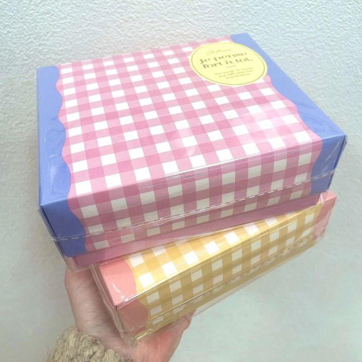 うねうねデザインとチェック柄の組み合わせが韓国っぽい「タルトボックス」です。高さが48mmあるので、商品名のとおりタルトやケーキなどを入れるのにぴったり。食品もそのまま入れられるので、手軽にラッピングできますね。