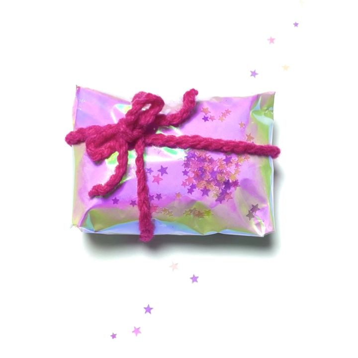 かわいいものが大好きな友人へのプレゼントにぴったりな、ゆめかわラッピングアイデア。オーロラクリアシートとコピー用紙を重ねて包装し、間に星のスパンコールを閉じ込めています。ビビッドカラーの毛糸がアクセントになっていて、ファンタジーな世界観に思わずキュン♡
