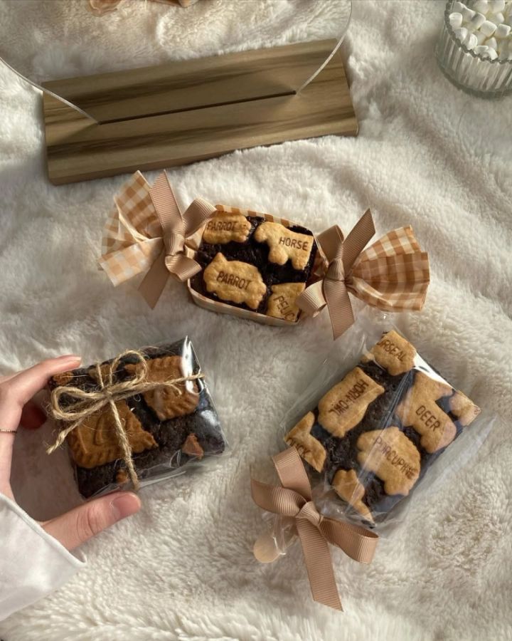 こちらも、すべて100均のアイテムを使用したラッピングアイデアです。クリアバッグの上から麻ひもやリボンを結ぶことで、同じブラウニーでもそれぞれ違った印象になります。同系色で統一したチェックのワックスペーパーとリボンを使ったラッピングも、おしゃれでとてもかわいいですね♡