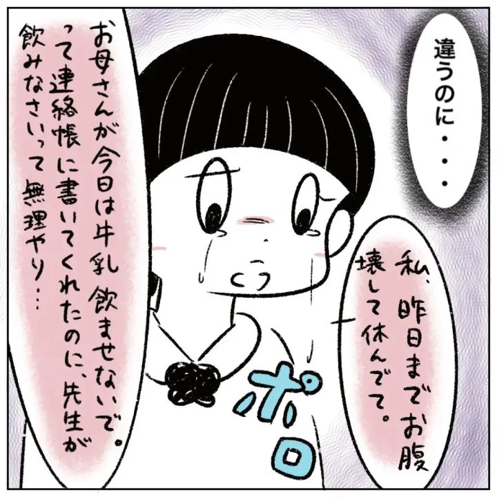 校長先生の対応に「違うのに・・・」とショックを受けたまるさん。「私、昨日までお腹壊して休んでて。お母さんが今日は牛乳飲ませないでって連絡帳に書いてくれたのに、先生が飲みなさいって無理やり・・・」と話しているうちに涙があふれてきました。