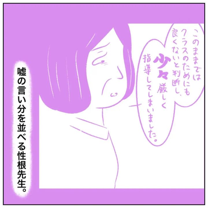 涙ながらに性根先生の酷い行為を訴えるまるさんと、まるさんを悪知恵の働くわがままな子だと主張し自分の行為を正当化する性根先生。食い違う2人の言い分に校長先生は困惑します。
