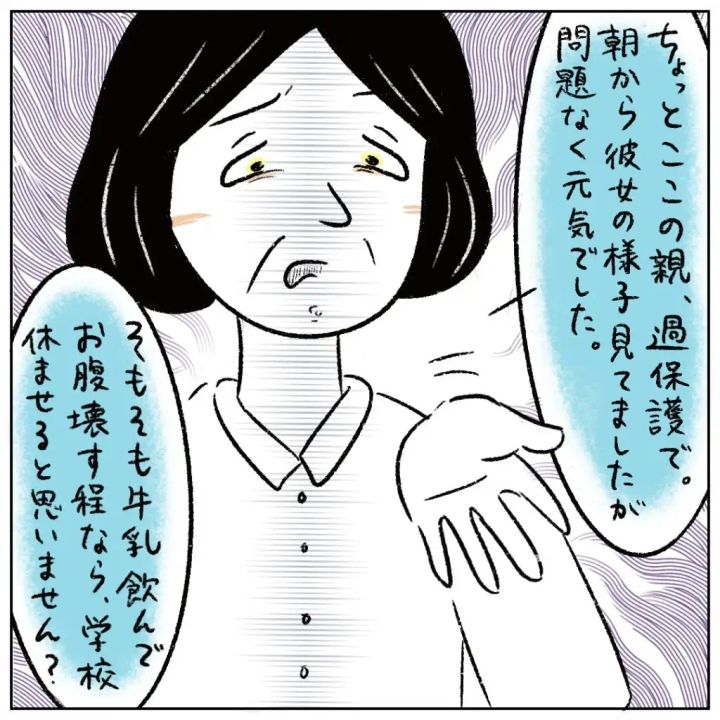 すぐさま「ちょっとここの親、過保護で。朝から彼女の様子見てましたが問題なく元気でした。そもそも牛乳飲んでお腹壊すほどなら、学校休むと思いません?」と校長先生に訴えます。