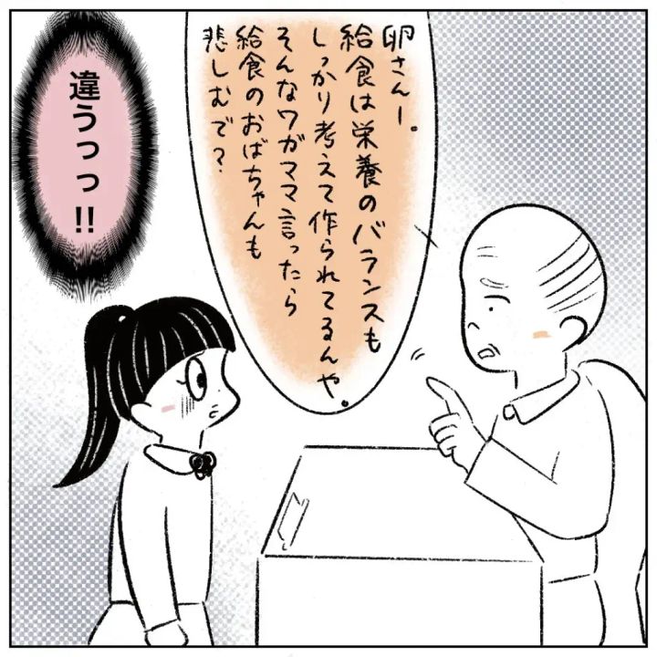 すると校長先生は性根先生の嘘の説明を信じたのか、「卵さんー。給食は栄養のバランスもしっかり考えて作られてるんや。そんなワガママ言ったら給食のおばちゃんも悲しむで?」とまるさんをたしなめます。自分の必死の訴えを信じてもらえずショックを受けたまるさんは「違うっっ!!」と心の中で叫びますが、言葉には出せません。