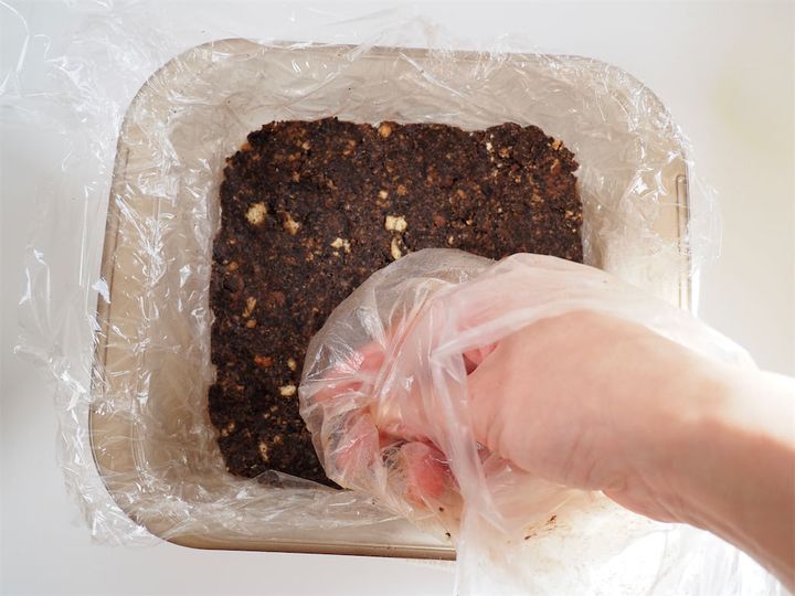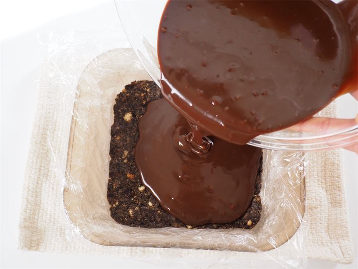 3. 容器にラップを2重に引いたら2を敷き詰め、冷蔵庫で10〜15分ほど冷やしておく。